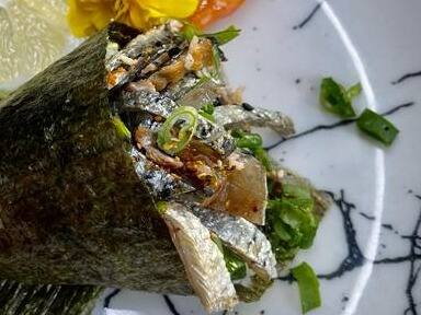 Arroz, Pele de peixe frita, Cream Chesse, Cebolinha e Nori (alga).Aproximadamente 200 gramas.